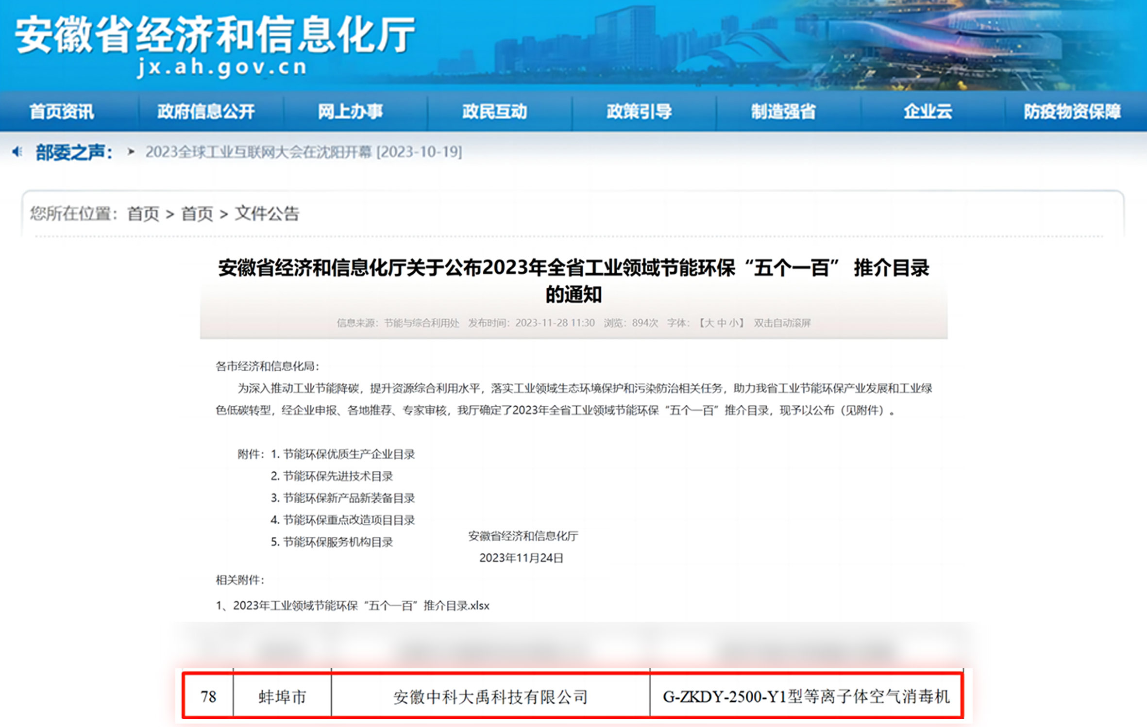 入選2023年全省工業(yè)領(lǐng)域節(jié)能環(huán)?!拔鍌€(gè)一百”推介目錄(節(jié)能環(huán)保新產(chǎn)品新裝備:G-ZKDY-2500-Y1型等離子體空氣消毒機(jī))
